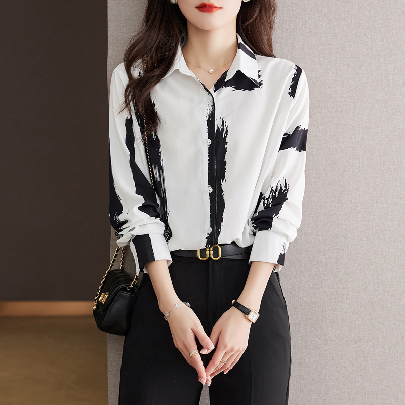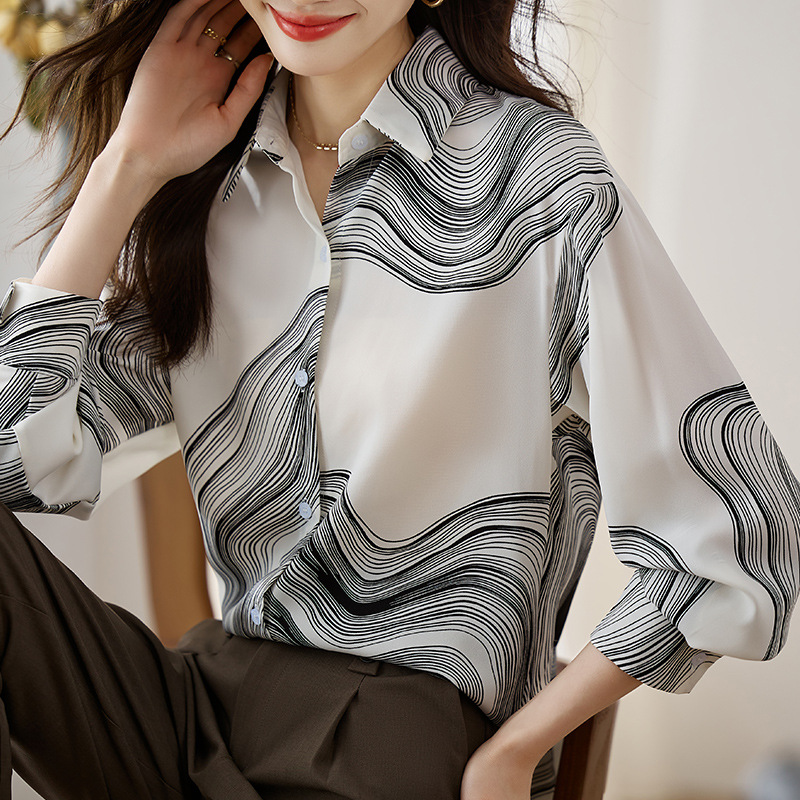 国境を越えたソース2023秋の新しいプリントストライプの長袖に白いシフォンシャツの女性を合わせる