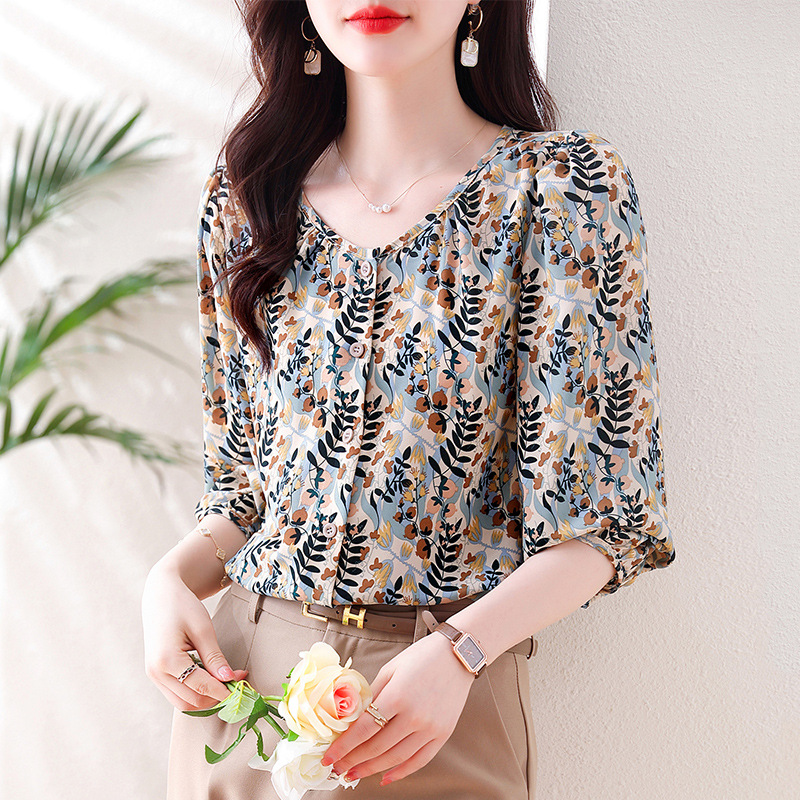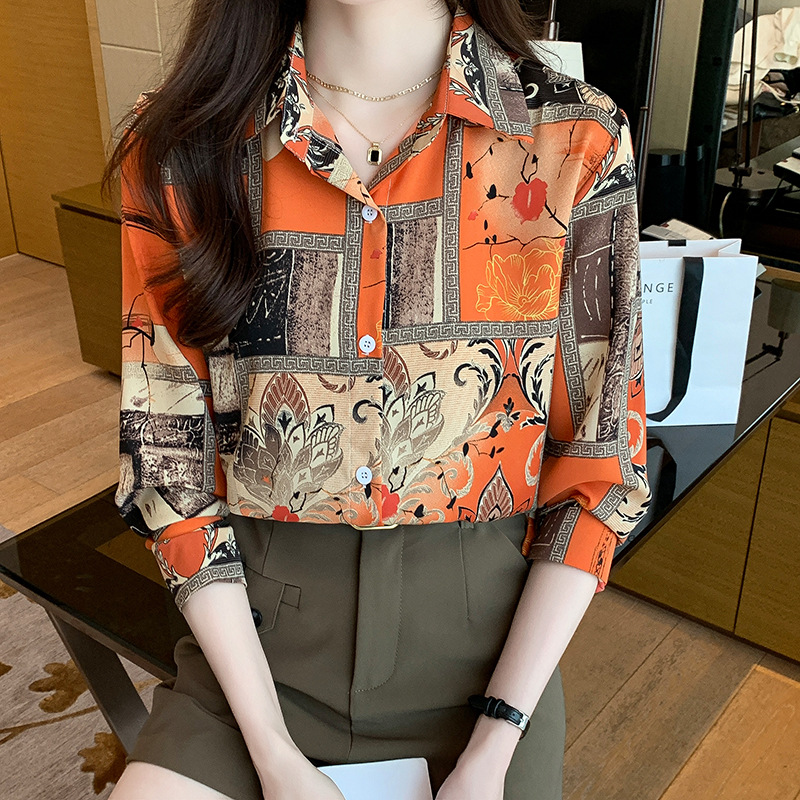 国境を越えた対外貿易の供給源であるサテンのシルクプリントシャツの女性2024春の新型高級減齢ブラウス