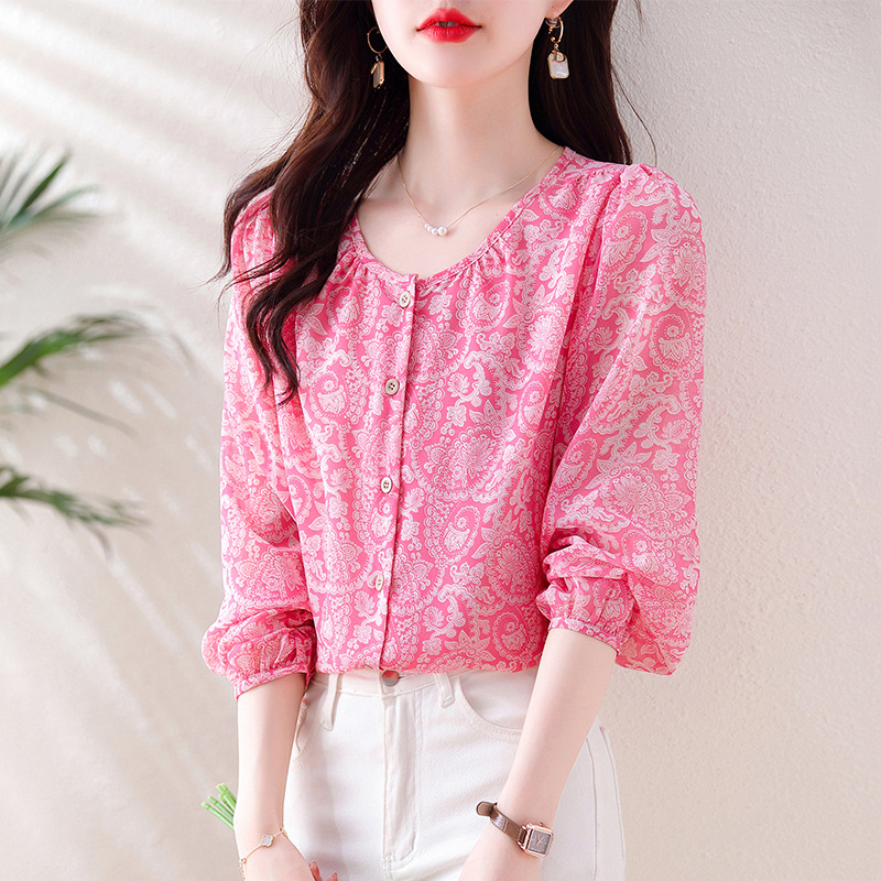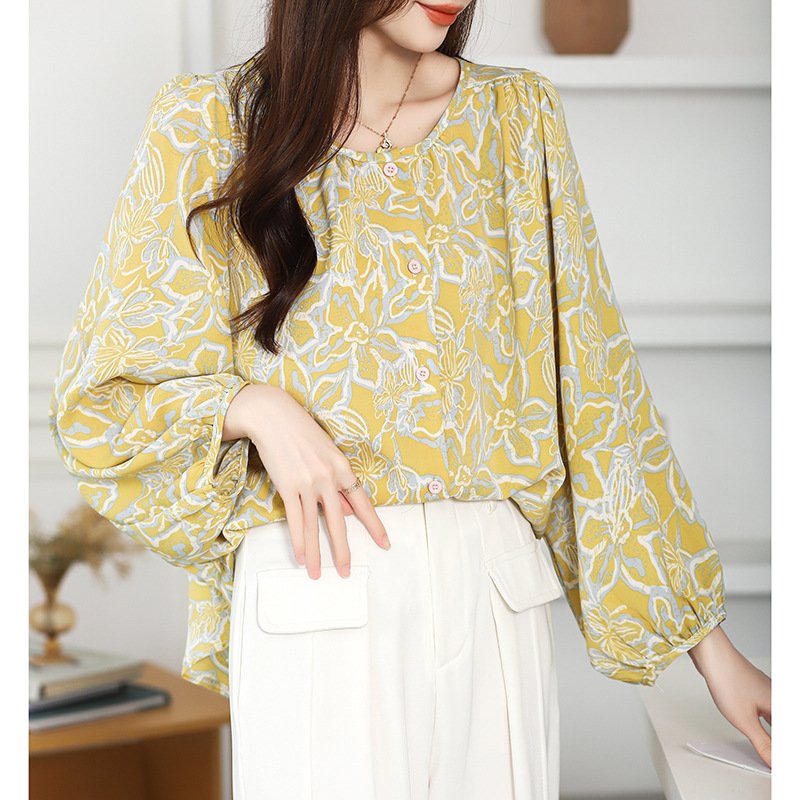 クロスボーダーの商品の切り花のジャカードの生地のシフォンの上着の女性の2023秋の新型の気質の底のシャツの女性