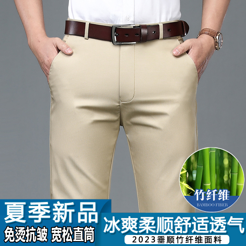 2023夏の薄い竹繊維の男性のカジュアルなズボンのまっすぐな筒のゆったりした弾力の中年のビジネスのズボンの卸売りのズボン