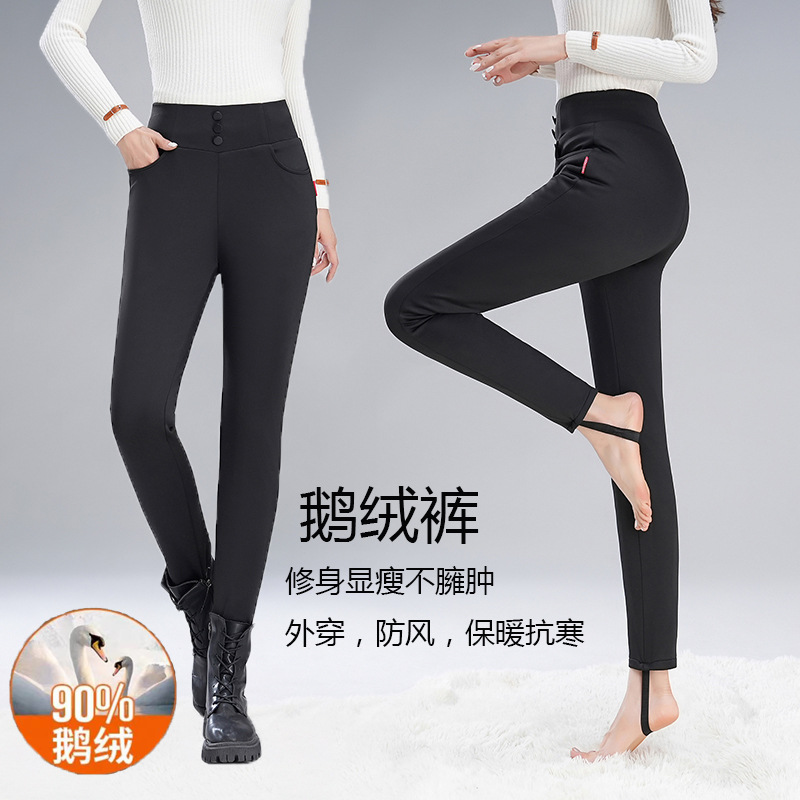 90ガチョウのベルベットのズボンの女性の背が高くてやせているのが見えて、ダウンジャケットのズボンの外に冬の保温弾力を厚くしてファッション的な黒いズボンを着ています