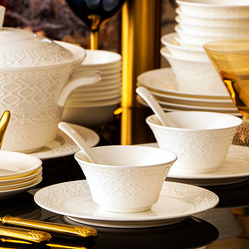 M^2024 新食器セット家庭用丼麺ボウル純白エンボス皿魚皿ボーンチャイナ食器天禧