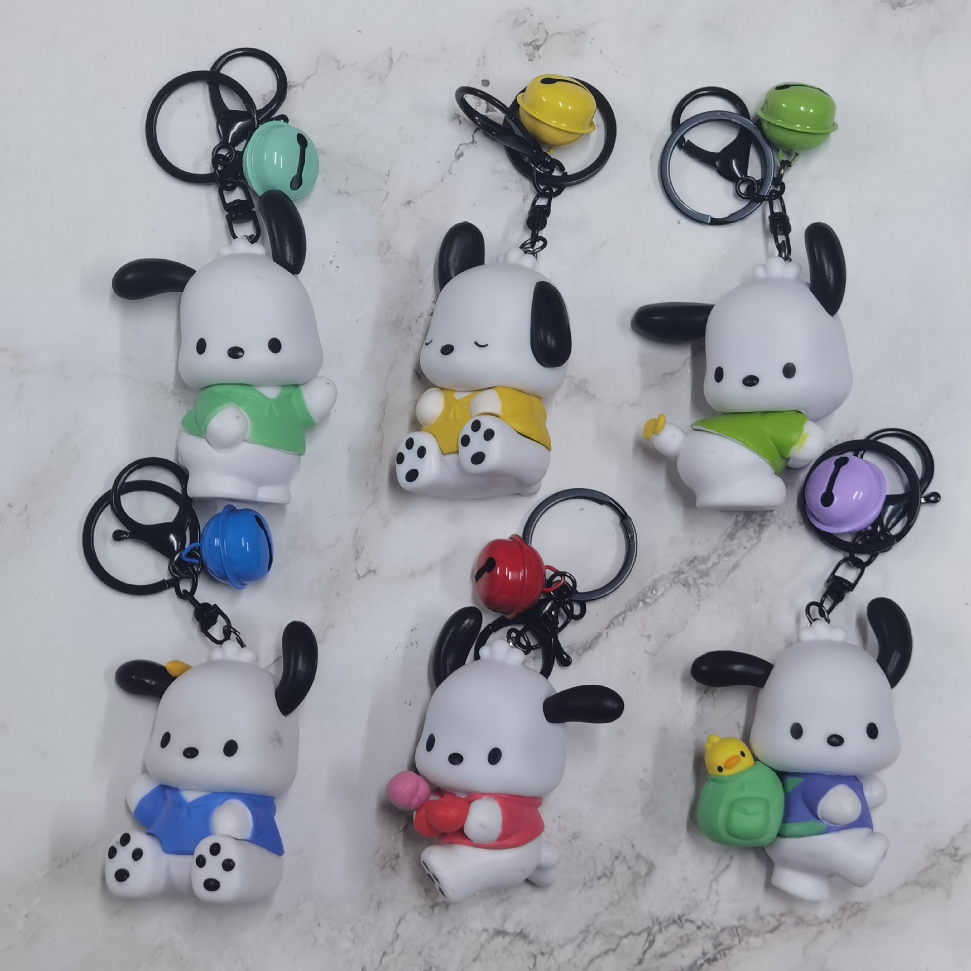 6種類のパチャ犬のぬいぐるみがキーホルダーを作って人形を飾って人形を捻って人形を飾っている