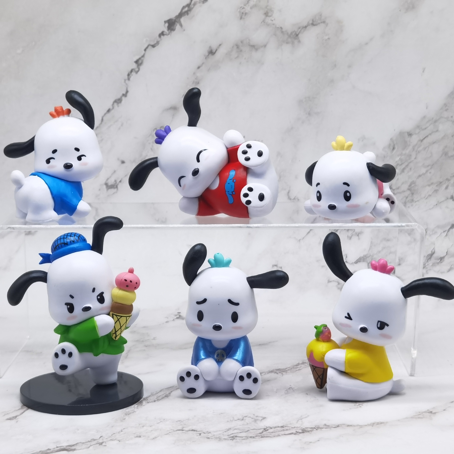 6種類のパチャ犬のぬいぐるみが人形を飾っています。