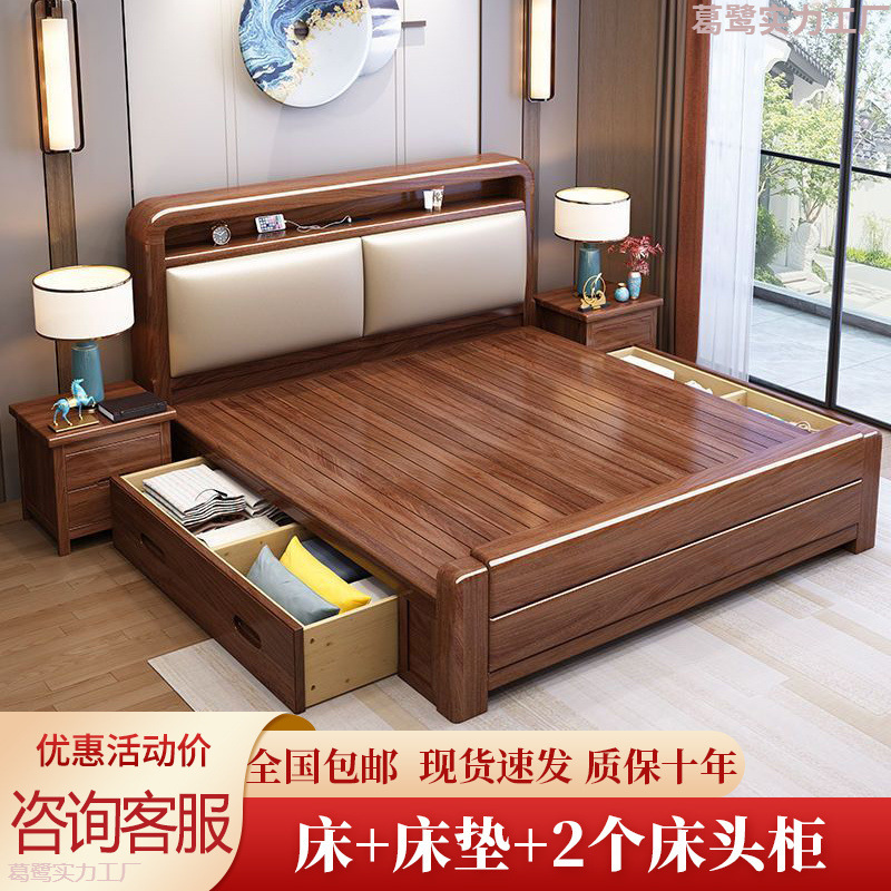 ソフトバッグ胡桃木現代シンプルベッド全実木ベッド厚いツインベッド主臥二次臥高箱貯蔵物ベッド