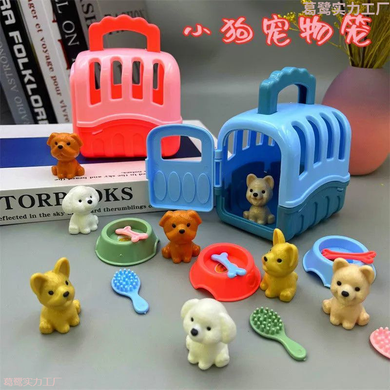 子供のおもちゃの子犬のペットのケージの男の女の子のおもちゃのクリスマスのプレゼントのシーンは赤ちゃんのおもちゃのままごとを演じます。
