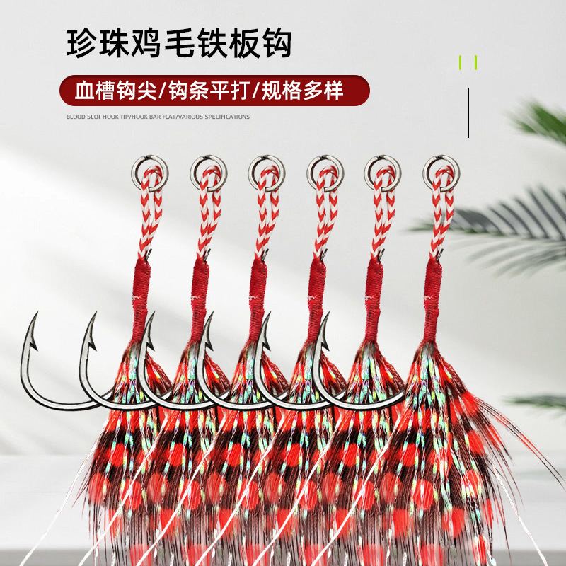 真珠鶏毛鉄板フック 羽根鋭利フック先 シングルフック ルアーフック 海釣りフック 船釣りフック シーバス釣りフック 逆刺