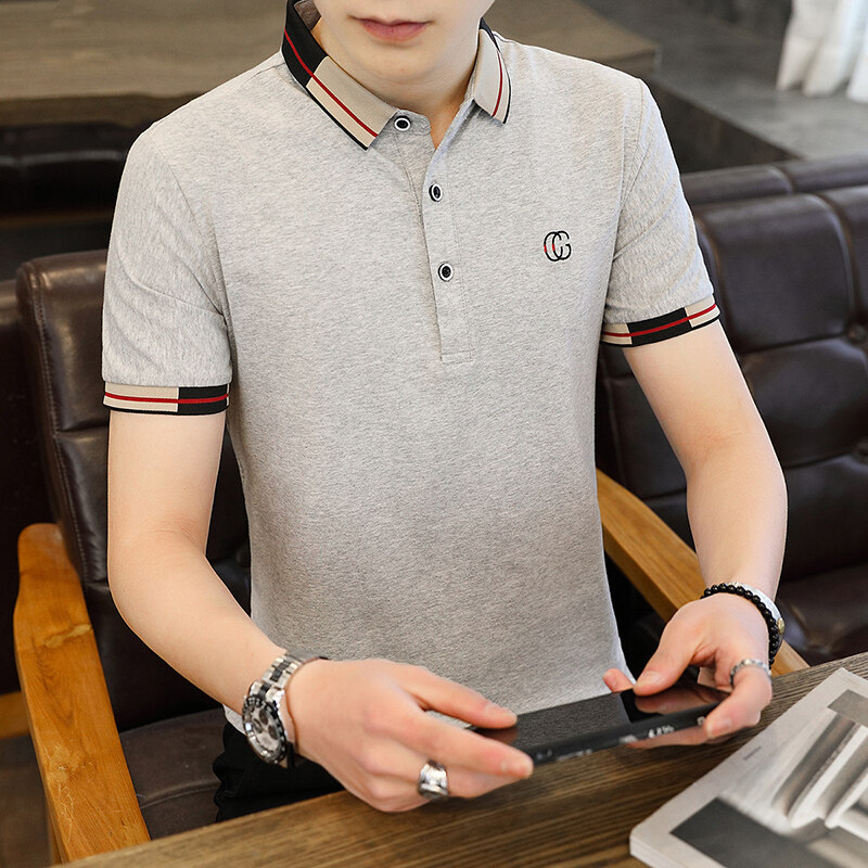 夏服 ラペル半袖Tシャツ クラシック刺繍ラペル スリムポロシャツ