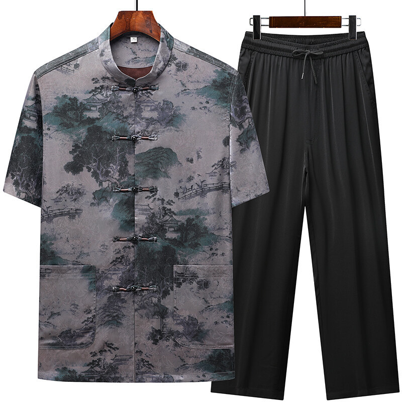 中高年唐スーツ半袖メンズ中国風スーツお父さんスーツダークグレースーツグリーングレースーツ在庫ありその他