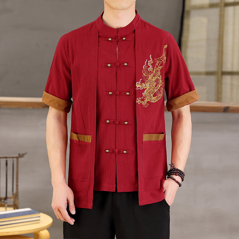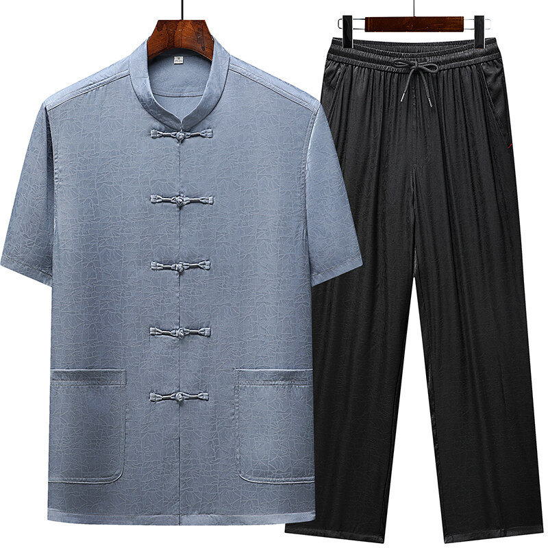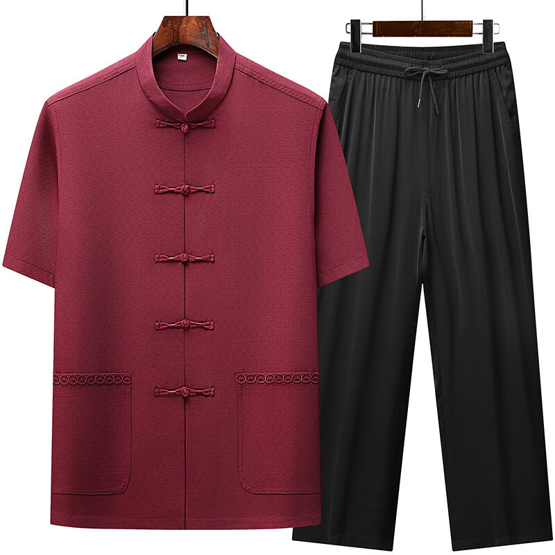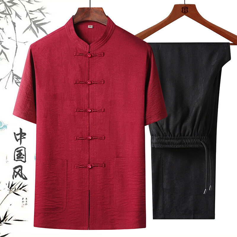 中高年唐装メンズ半袖スーツアイスシルク漢服メンズレッドスーツブルースーツブラウンスーツ在庫あり