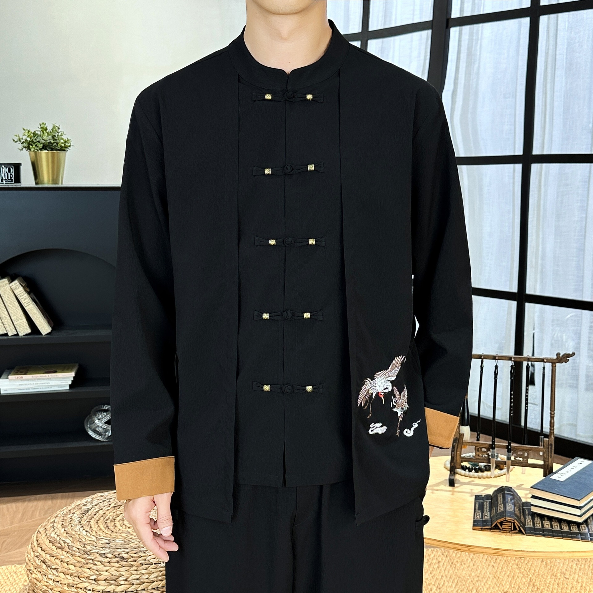 新しい中国風の刺繍スーツ長袖ズボン唐装漢服国民風エスニックスタイル白黒在庫あり