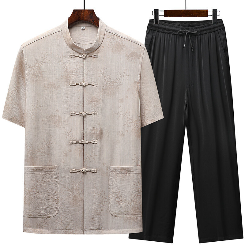 中高年唐装メンズ半袖スーツ中国風漢服ベージュスーツコーヒー色スーツ既製スーツその他