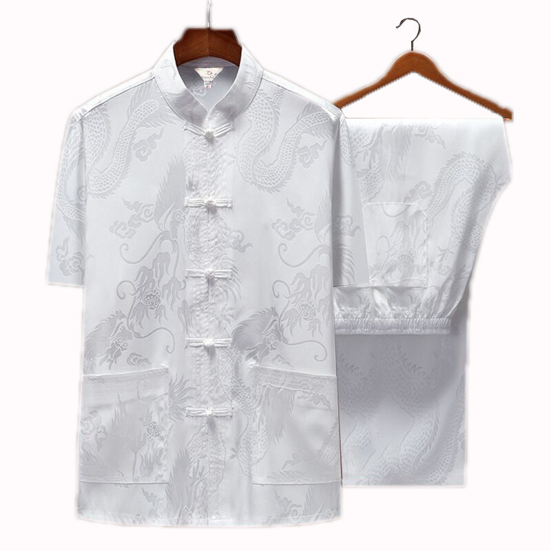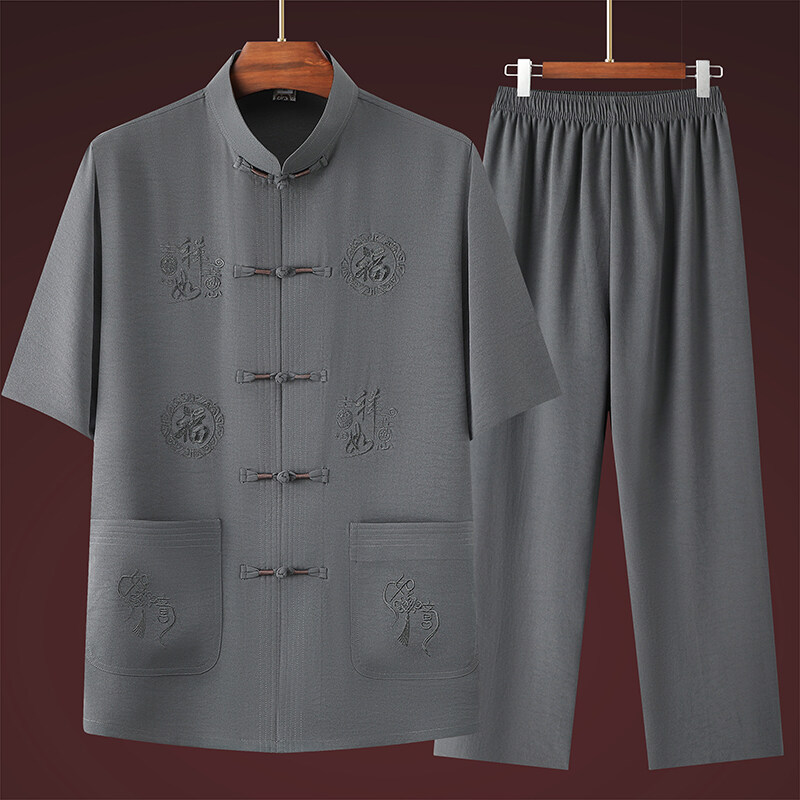 中国風メンズ夏半袖アイスシルク刺繍フライングドラゴン唐スーツお父さんツーピーススーツトップスツーピーススーツ