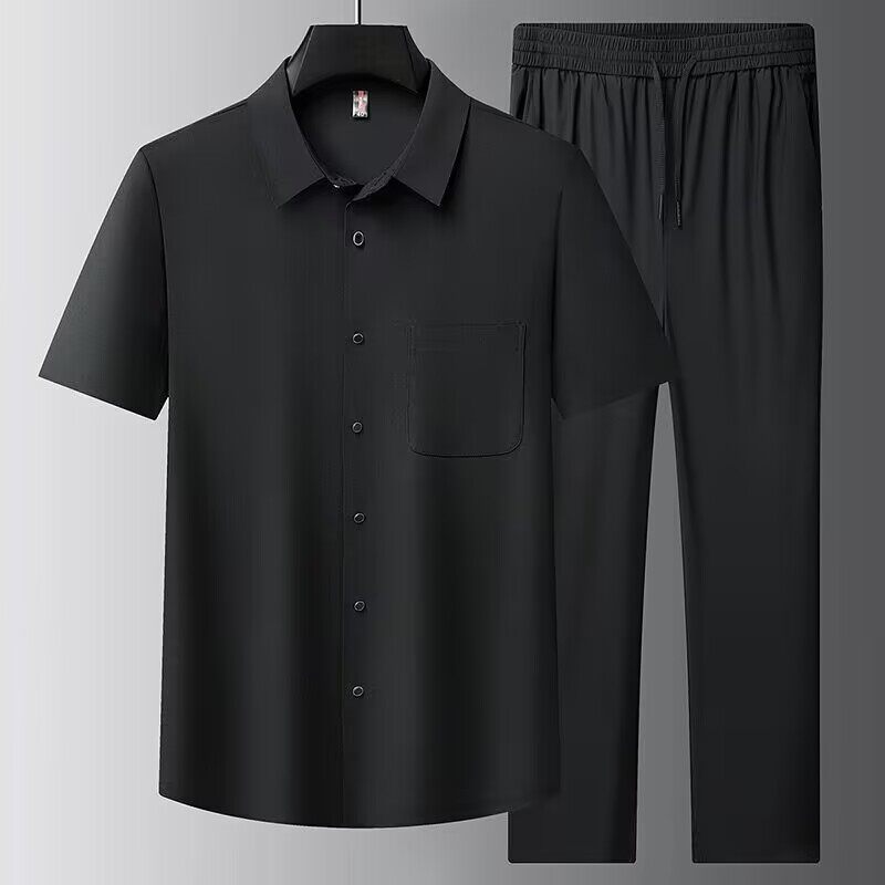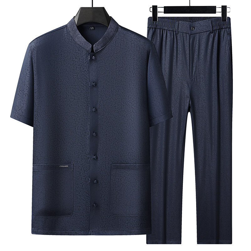模造酢酸氷シルクメンズ夏中高年中国風唐スーツ半袖Tシャツスーツ高品質黒