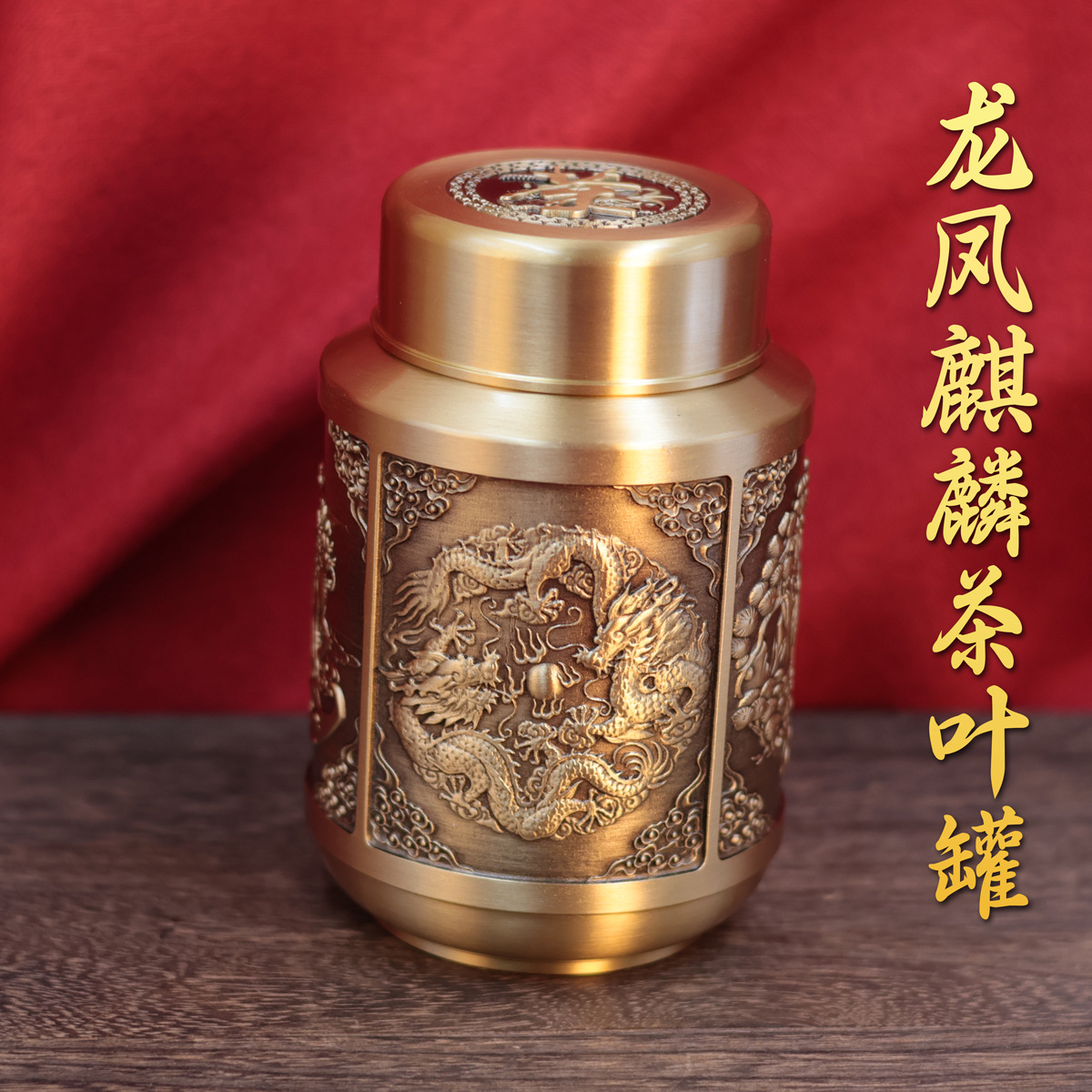 黄銅四祥茶葉缶招財龍鳳仙鶴麒麟茶葉缶置物蓋付き貯蔵缶工芸品置物