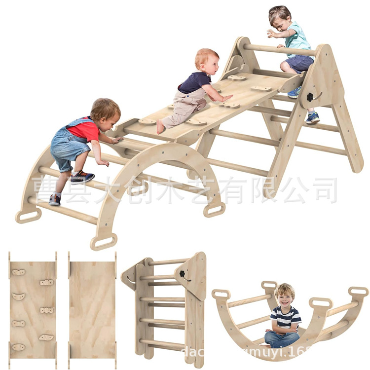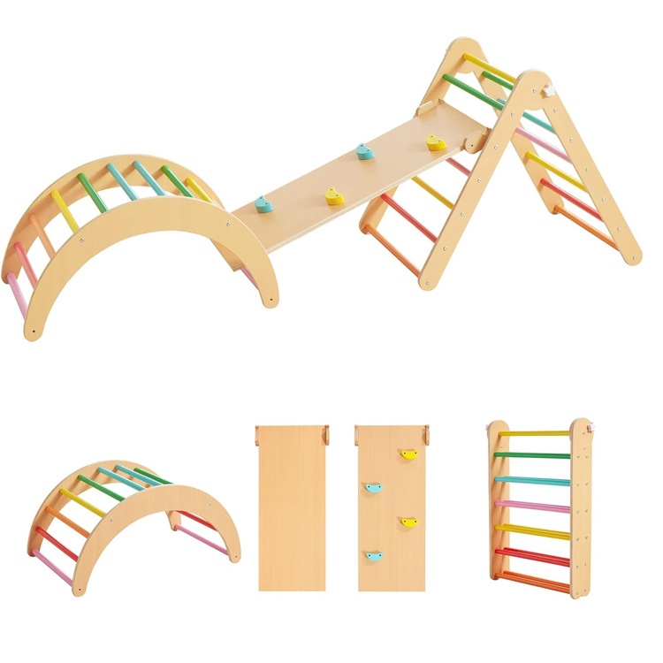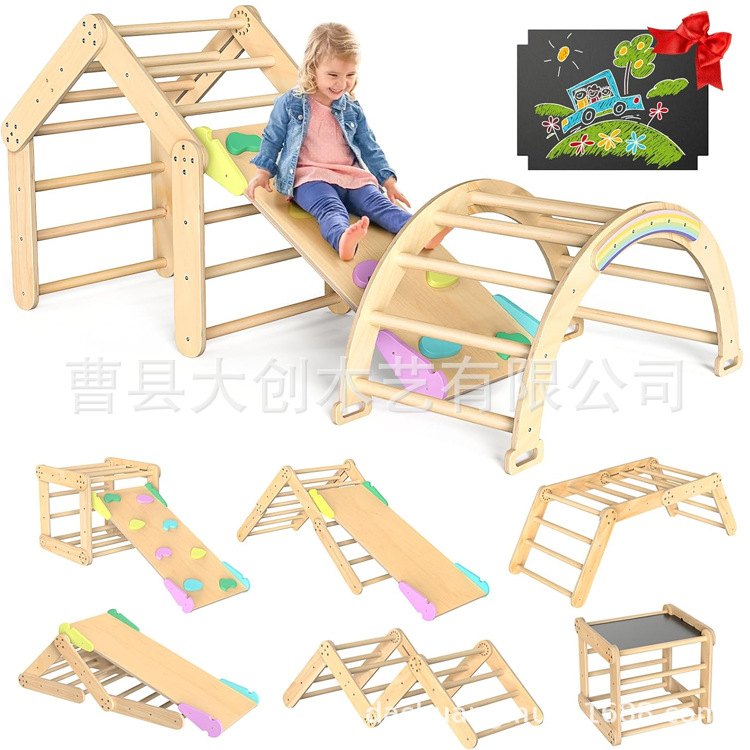 スライドスロープとロッククライミングアーチスロープ付きの7イン1変形トライアングルセット、木製幼児屋内遊び場