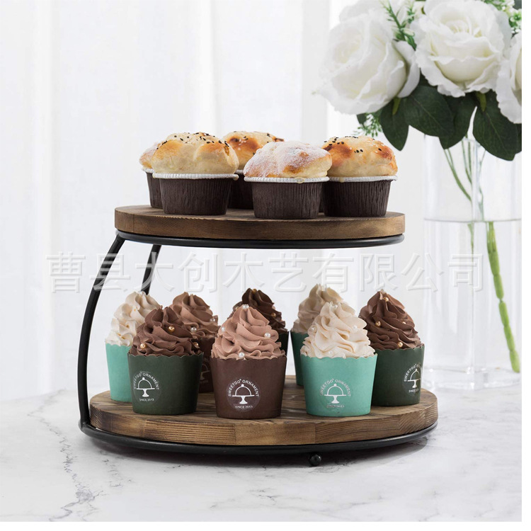 カスタム加工木製ケーキトレイ 2 層カップケーキスタンド皿デザートトレイ、ブラックメタルフレーム