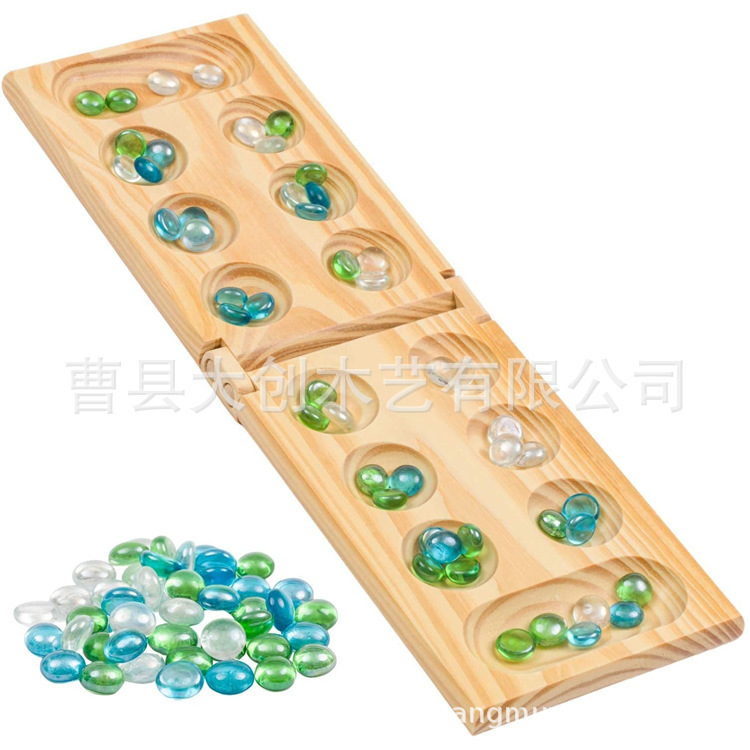 カスタム木製チェスボード折りたたみ式木製マンカラボードゲーム、ガラスストーン48個付き