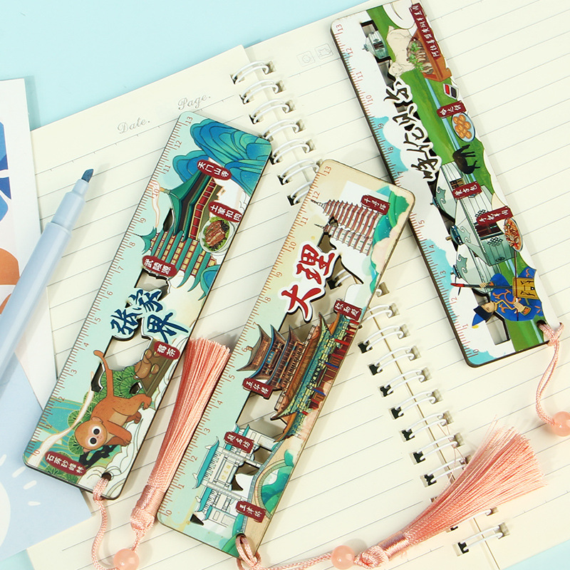 木造直尺風景名勝都市ランドマーク観光文創観光地区記念透かし彫り目付きブックマーク両用