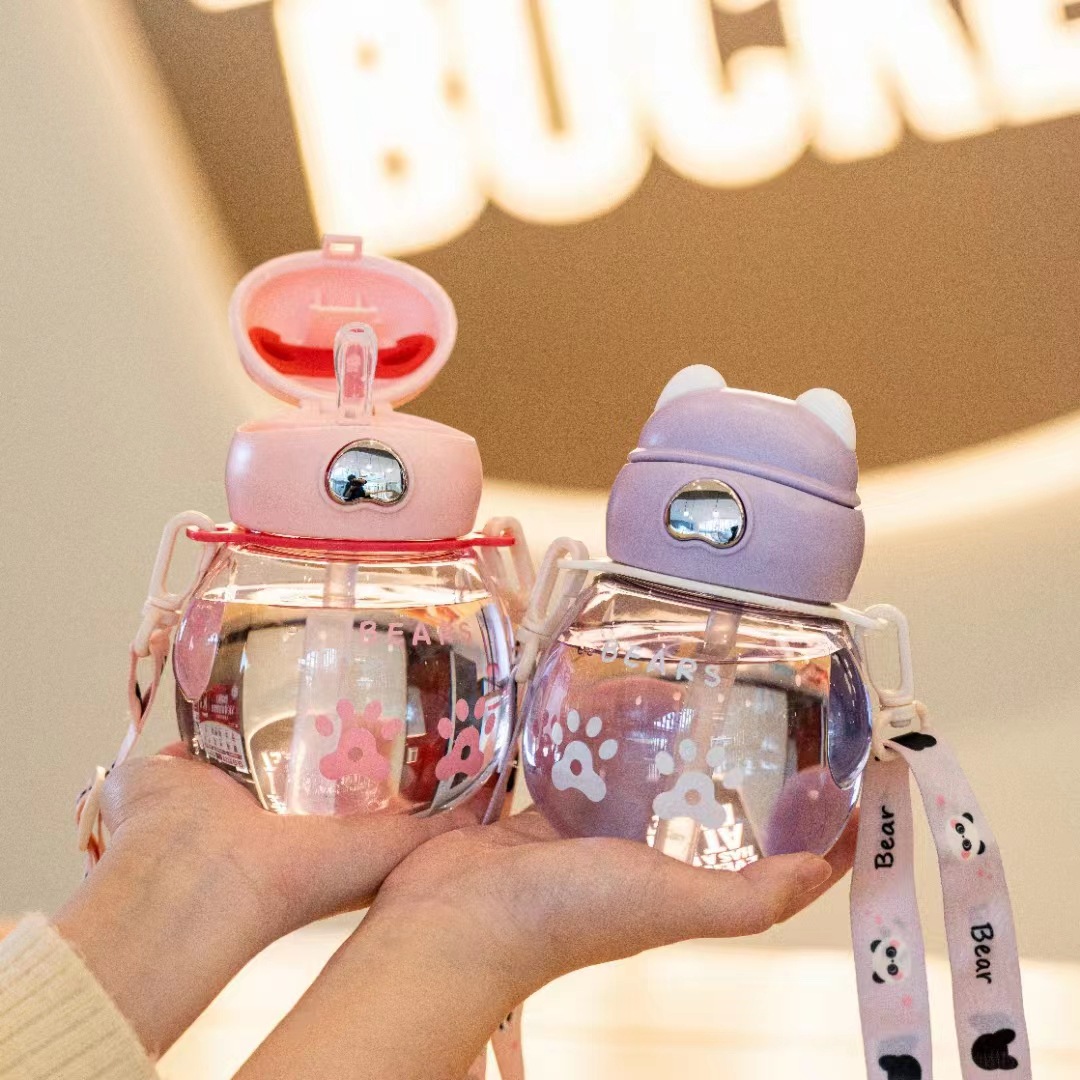 かわいい高颜値女子学生はストローカップ付きベアーカップ大腹カッププラスチックカップ児童学校水筒学生