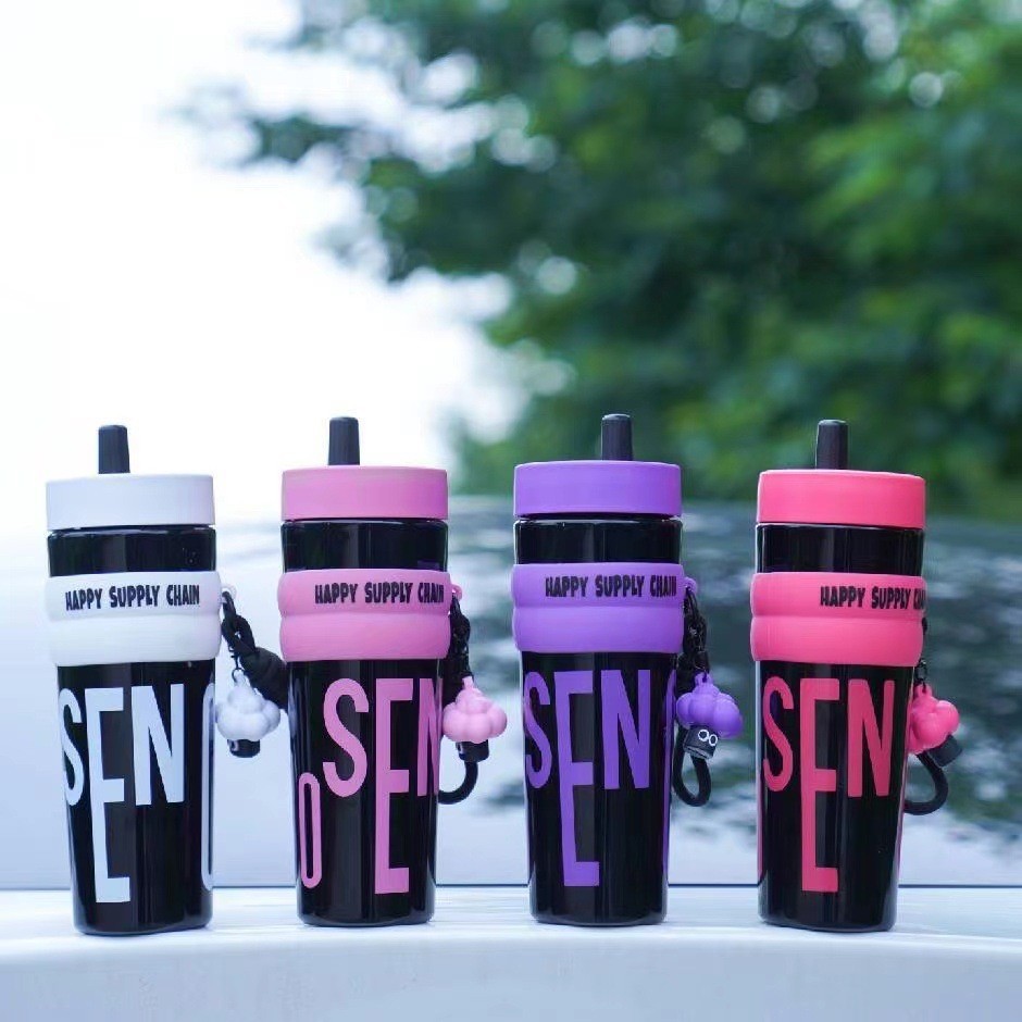 売れ筋の漫画のプラスチックカップ、見栄えの良い大容量のつや消しバウンシングストローカップ、ロープ付きポータブルカップ