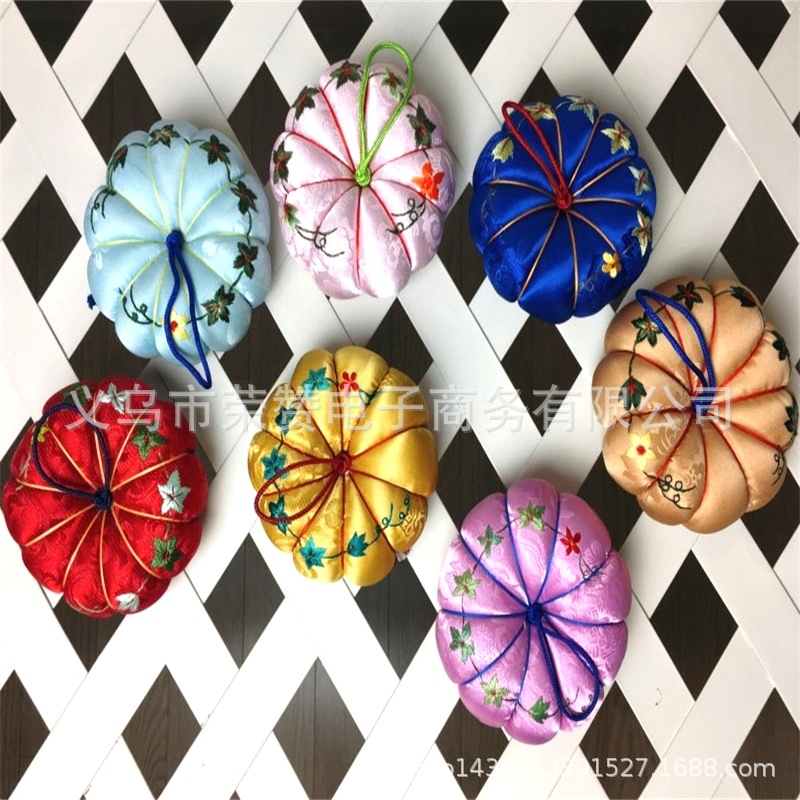 針はかぼちゃを包んで針を刺して丸い針の座の布芸の裁縫の道具の部品を刺します。