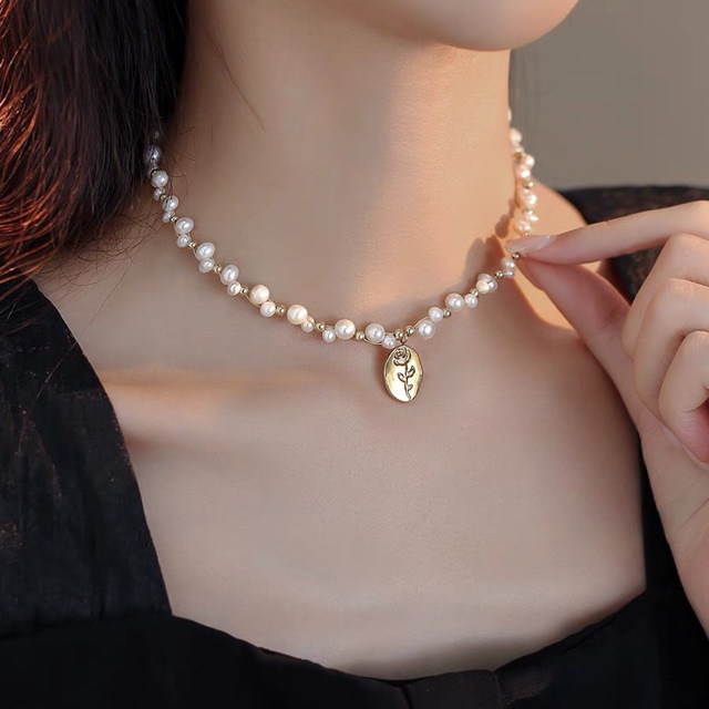 満天の星の天然真珠のネックレスの女性のフランス式の復古の高級感のバラの花のペンダントの鎖の鎖の小さい金の玉の首の鎖
