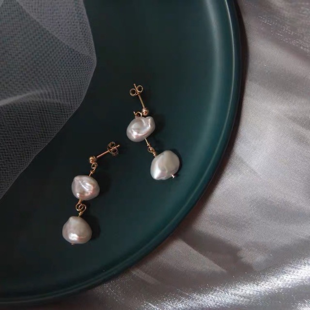 天然バロック花びら真珠イヤリング女性銀白色おばあちゃん灰14k注金耳飾りレトロ気質ファッション