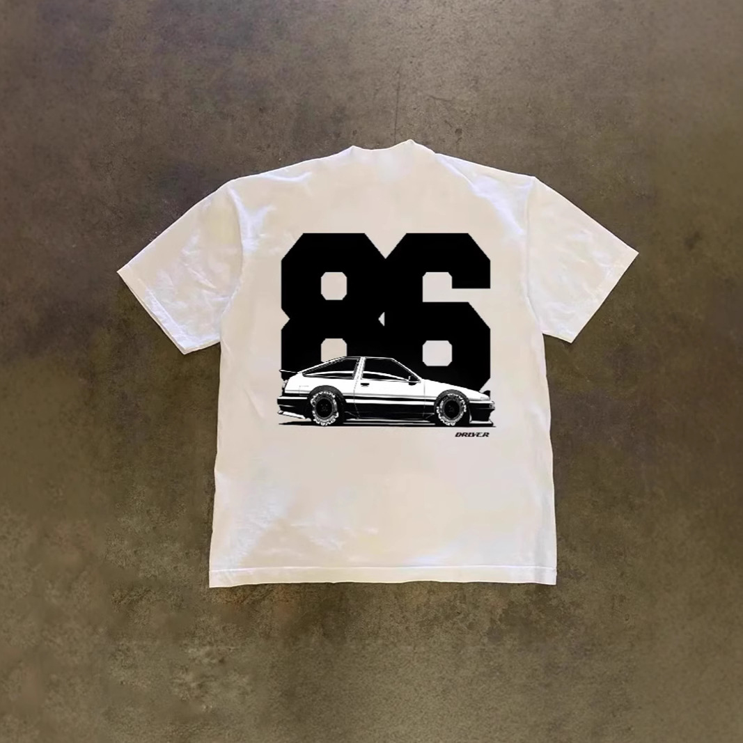 厚手の純綿250g!アメリカンオーバーサイズ86車クリエイティブプリントカップルレディースルーズ半袖Tシャツメンズトレンディ
