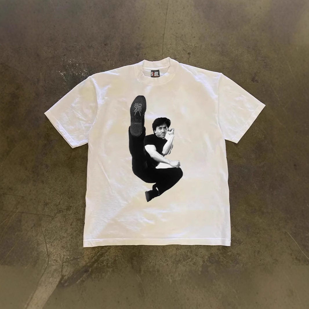 重いポンドの純綿250グラム! 中国のカンフー古着文字ジャッキー・チェン・プリントカップル男女のゆるい半袖tシャツ