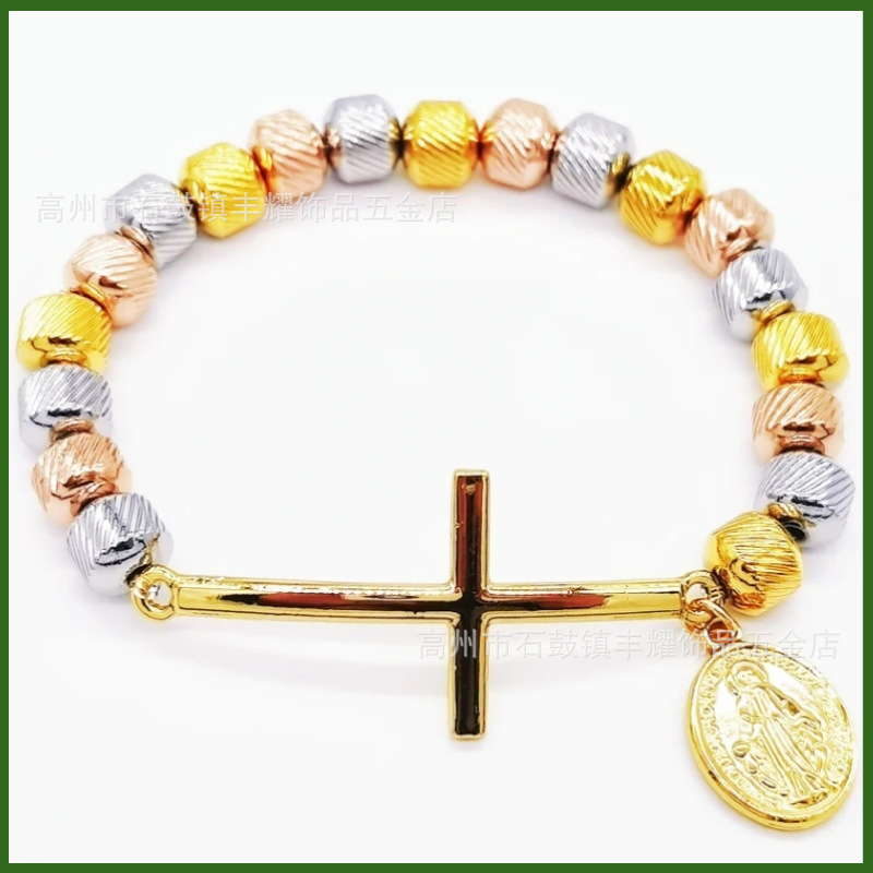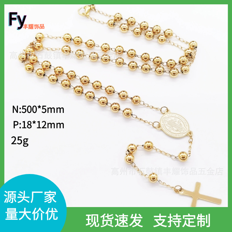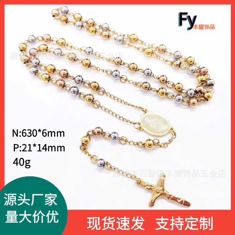 クロスボーダー熱売6mm金鋼薔薇三色仏珠ネックレス鎖骨鎖ステンレス玉ネックレスクロスネックレス