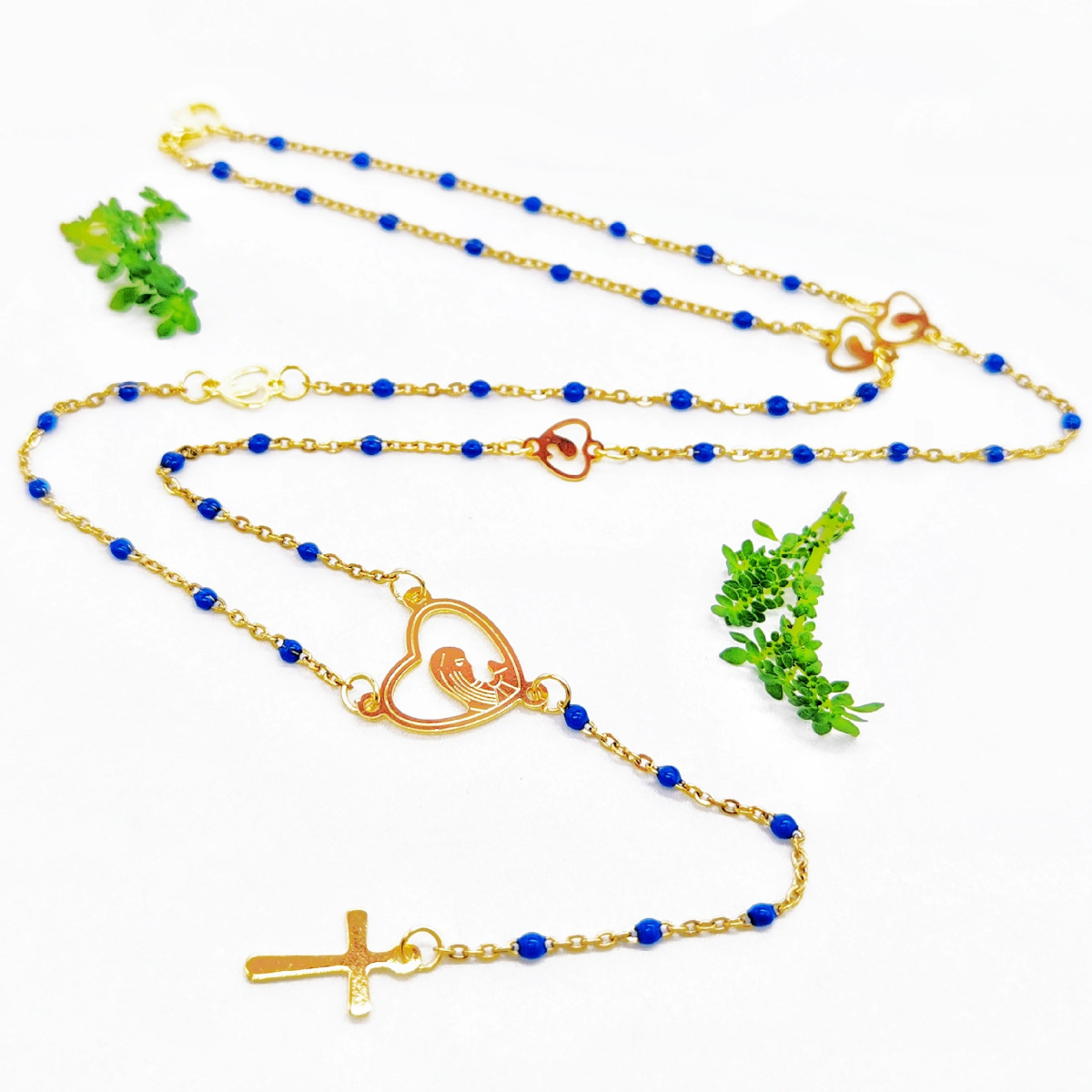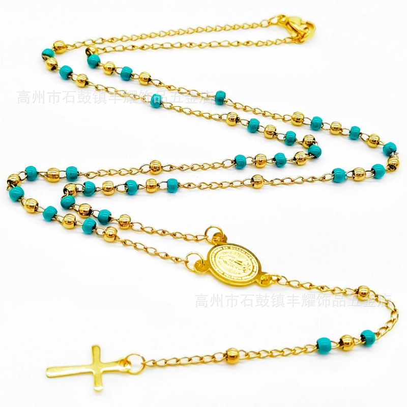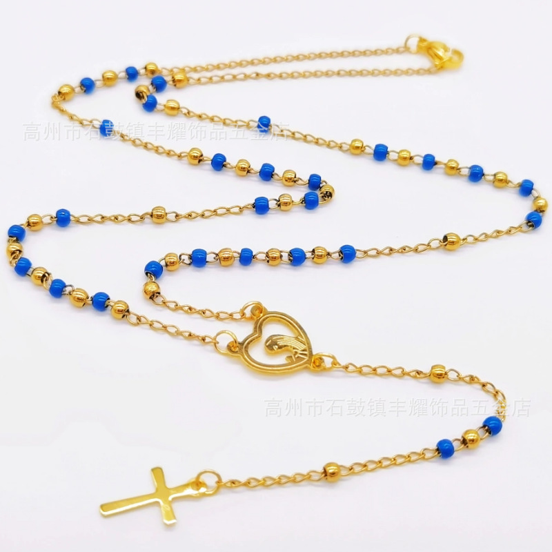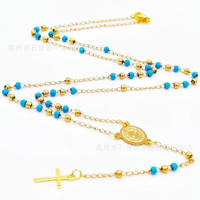 クロスボーダー热い贩売3mm金间青色仏ビーズネックレス锁ステンレス钢ラウンドビーズネックレスクロスネックレス