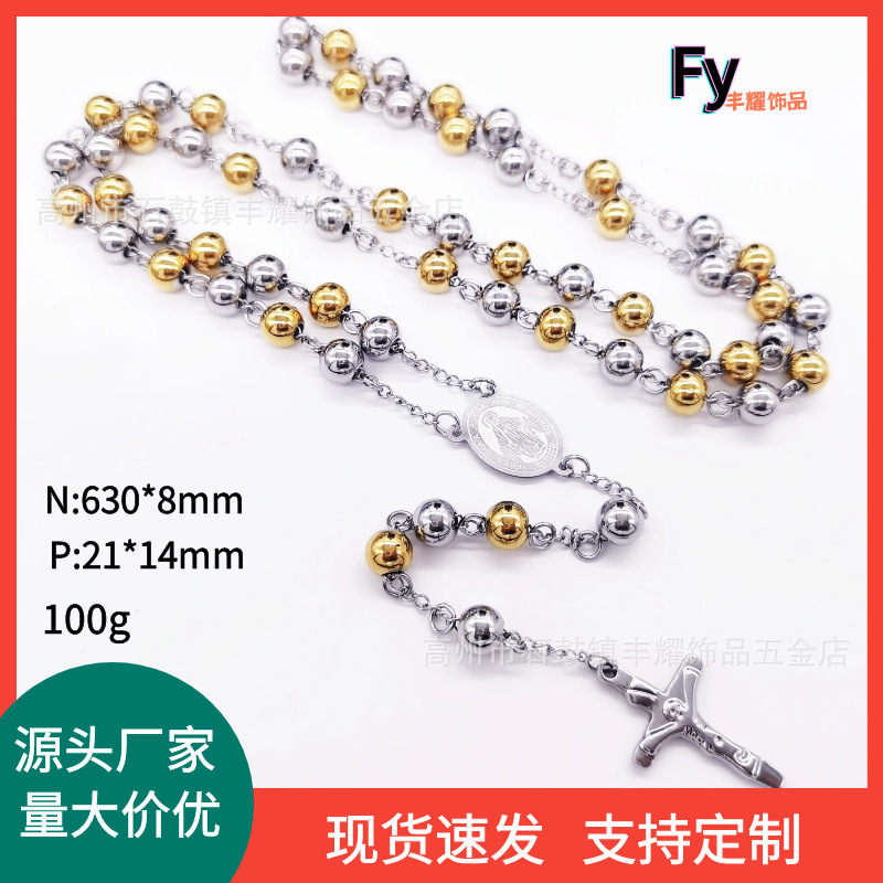 クロスボーダー熱売8mm鋼間金色仏珠ネックレス鎖骨鎖ステンレス丸珠ネックレスクロスネックレス