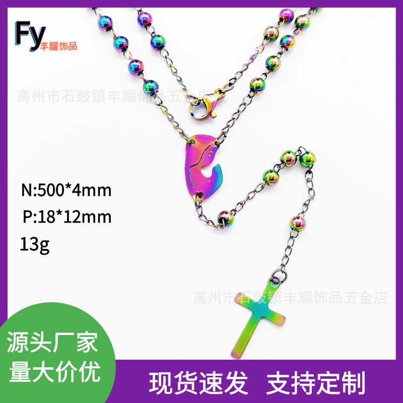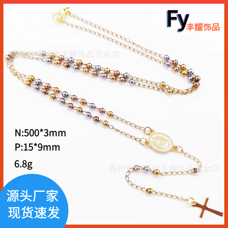 クロスボーダー熱売3mm金鋼薔薇三色仏珠ネックレス鎖骨鎖ステンレス丸珠ネックレス十字架ネックレスd