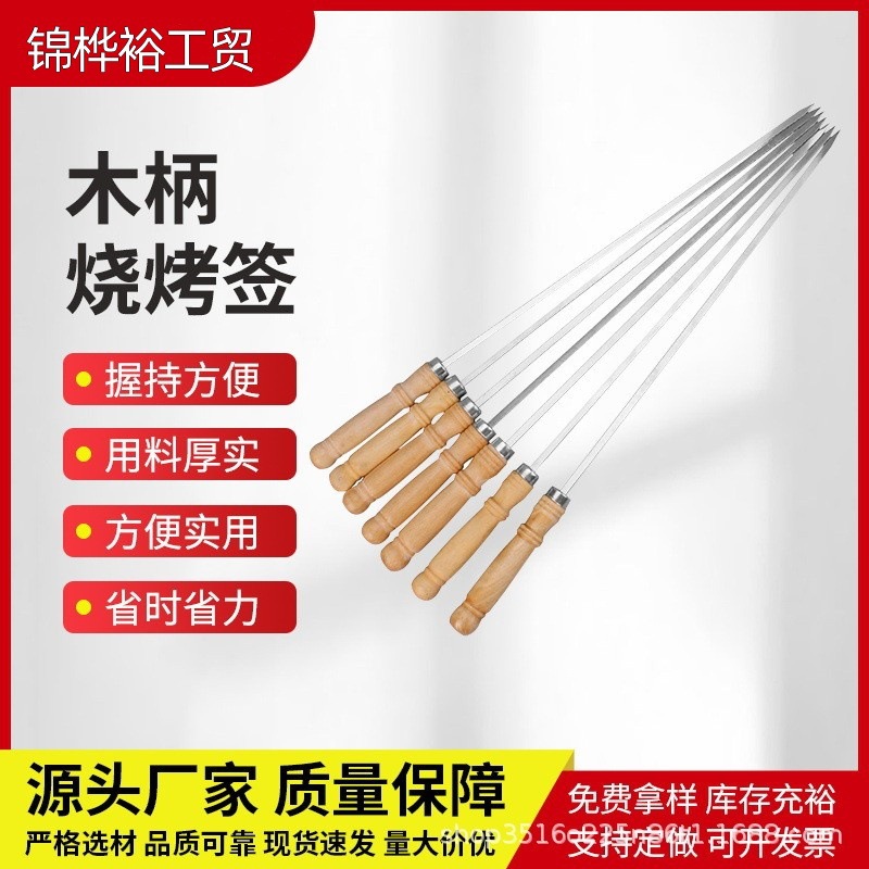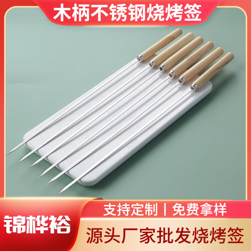 淄博バーベキュー卸売ステンレス鋼木製ハンドルバーベキューラム串ハンドル付きバーベキューニードルフォークフラットピックラウンドピック
