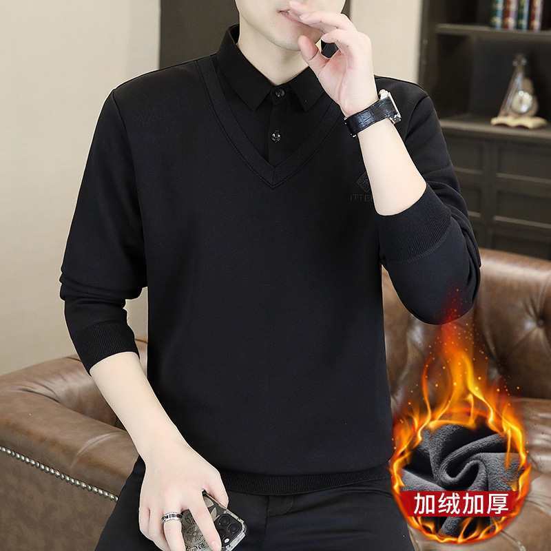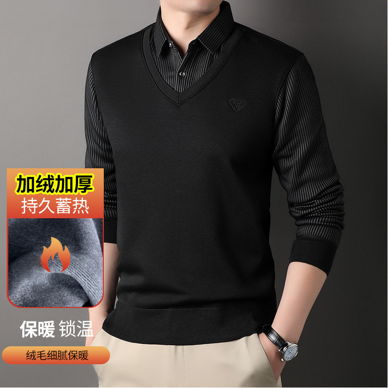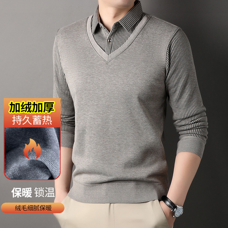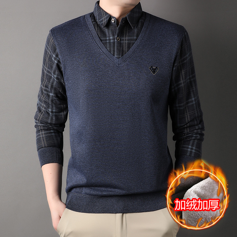 秋冬の男性の偽の2つのニットのシャツの襟のコートの男性のセーターの中にシャツとベルベットの厚い底のシャツを合わせます。