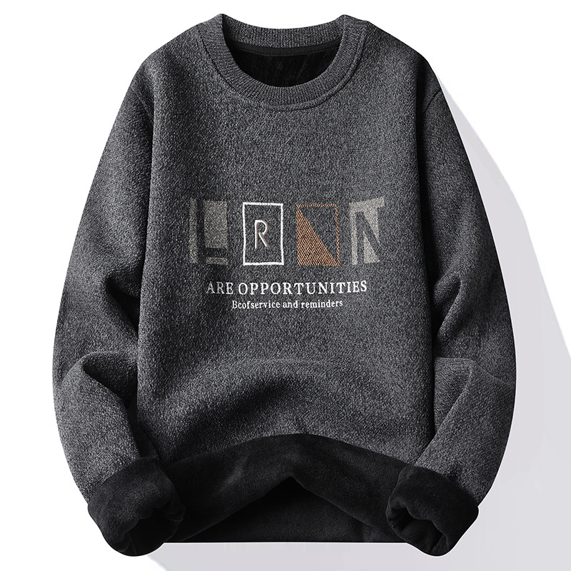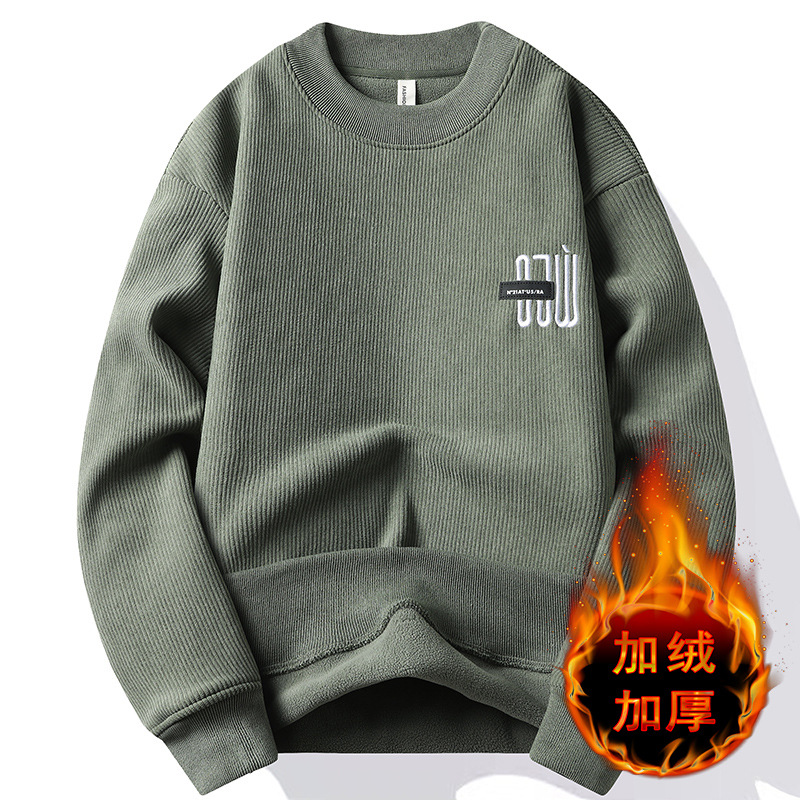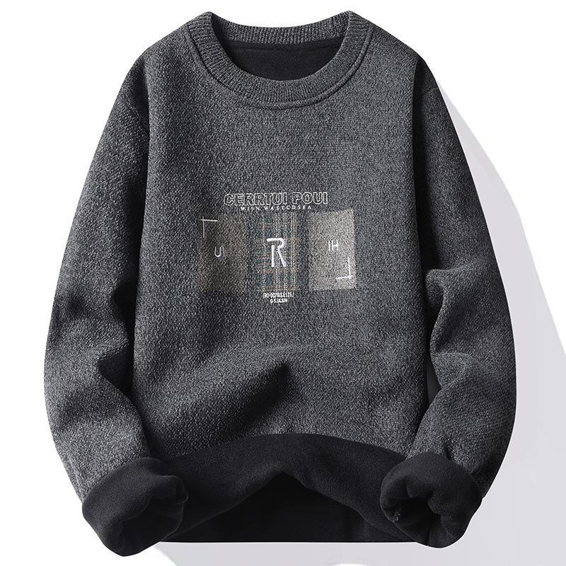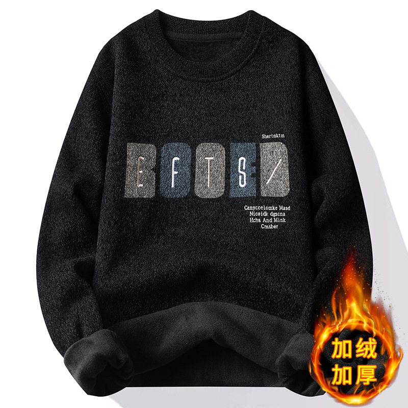 メーカー代発トレンド2024新ニットシャツ秋冬ベルベット厚手丸襟刺繍セーター男