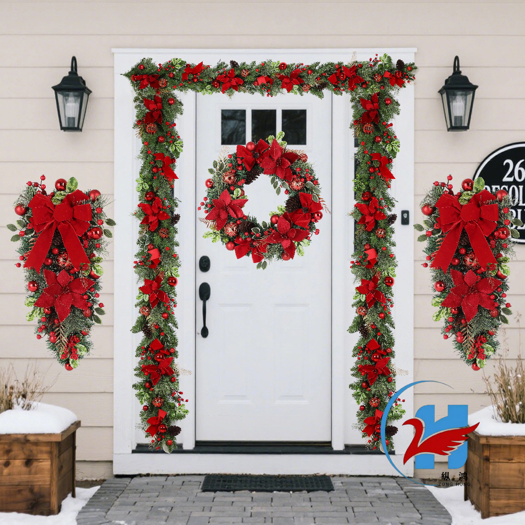 クロスボーダークリスマスリース、ベルベットの赤い花、クリスマス風デコレーションセット、ホリデーリース、逆さ飾り、ホームデコレーション