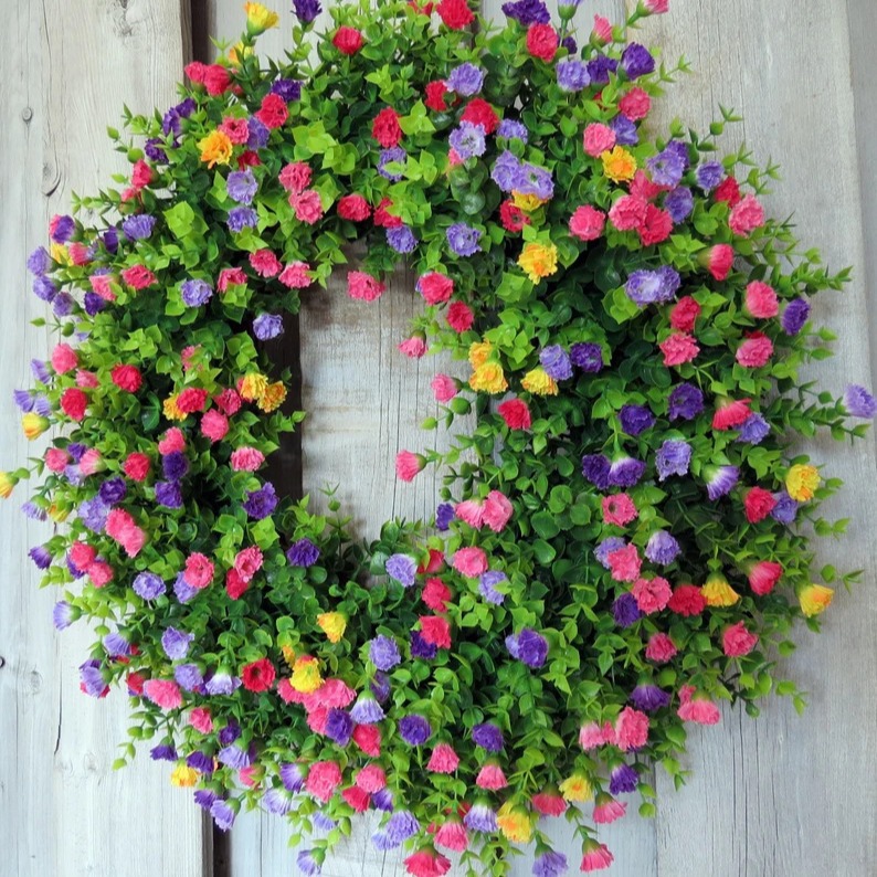 春の花輪、春の花祭りの装飾用花輪、ユーカリの花輪、ドア掛け