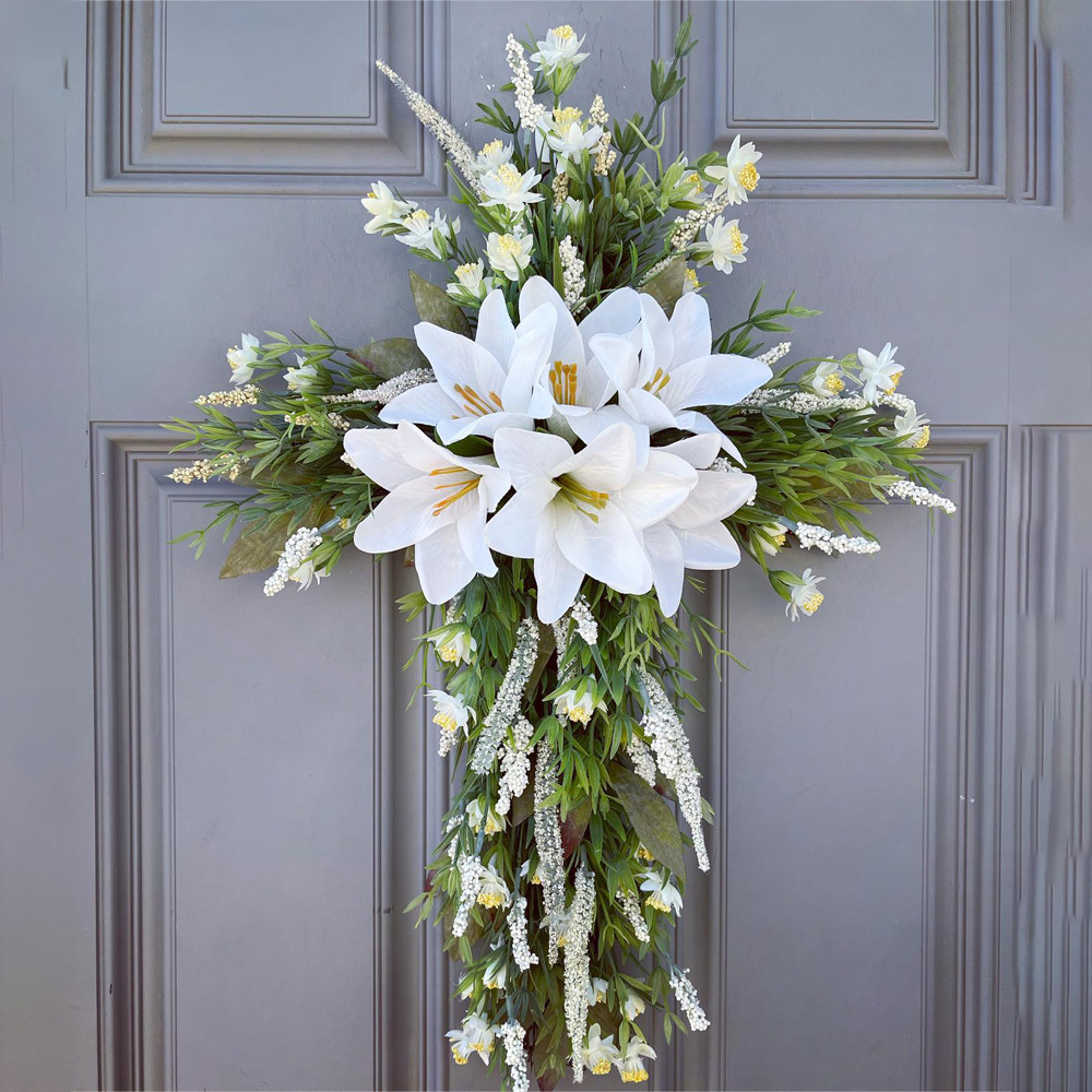 2024年イースターフラワーガーランド、十字架、ユリの花輪、ドア掛け飾り、アマゾン新商品