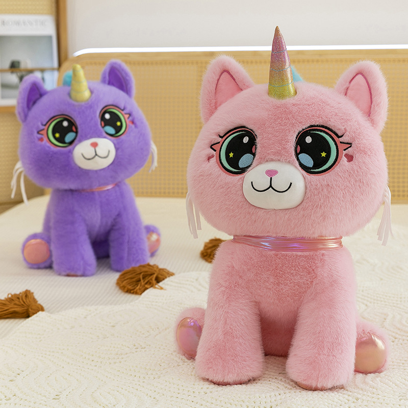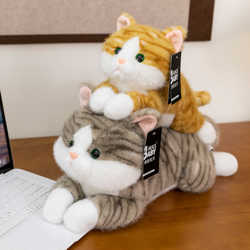 国境を越えて腹ばいになっている縞猫ぬいぐるみ子供の誕生日プレゼント