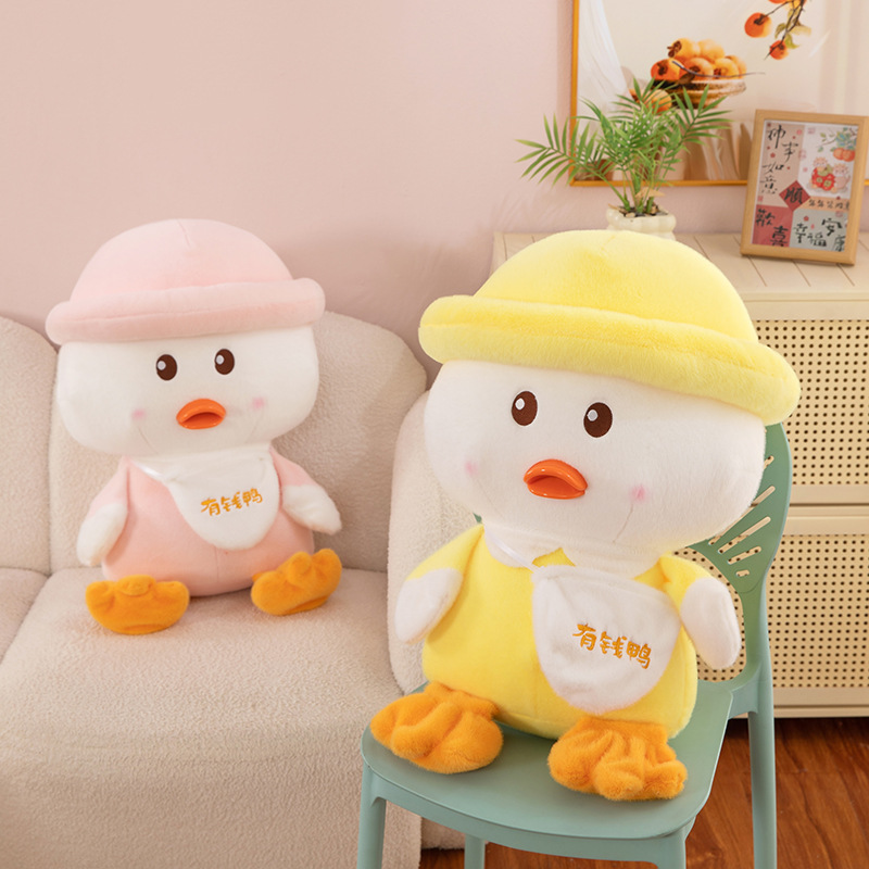 かわいい金持ちアヒルのぬいぐるみ子供が寝ている枕を抱えて帽子をかぶっているアヒルの家に誕生日プレゼントを飾る