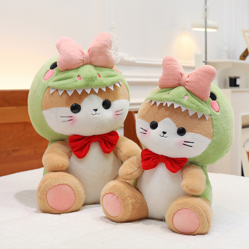 漫画の蝶結びの恐竜は猫のぬいぐるみに変身します。子供は寝ます。