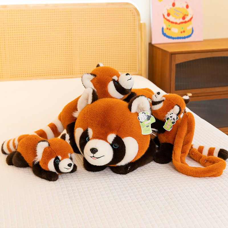 素直に腹ばいになったパンダのぬいぐるみ子供が人形動物園の記念品をなだめる