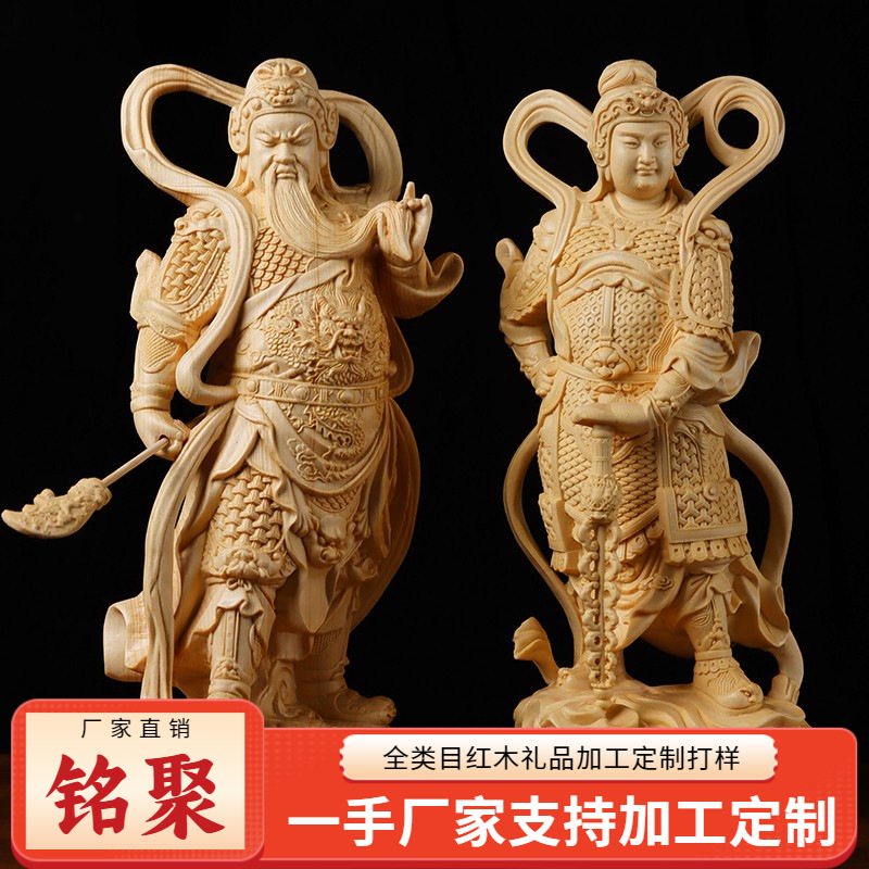 Mingju Guan Gong Jialan Weido 尊者左右の守護神像装飾品ヒノキ彫刻家の装飾オープニング作業