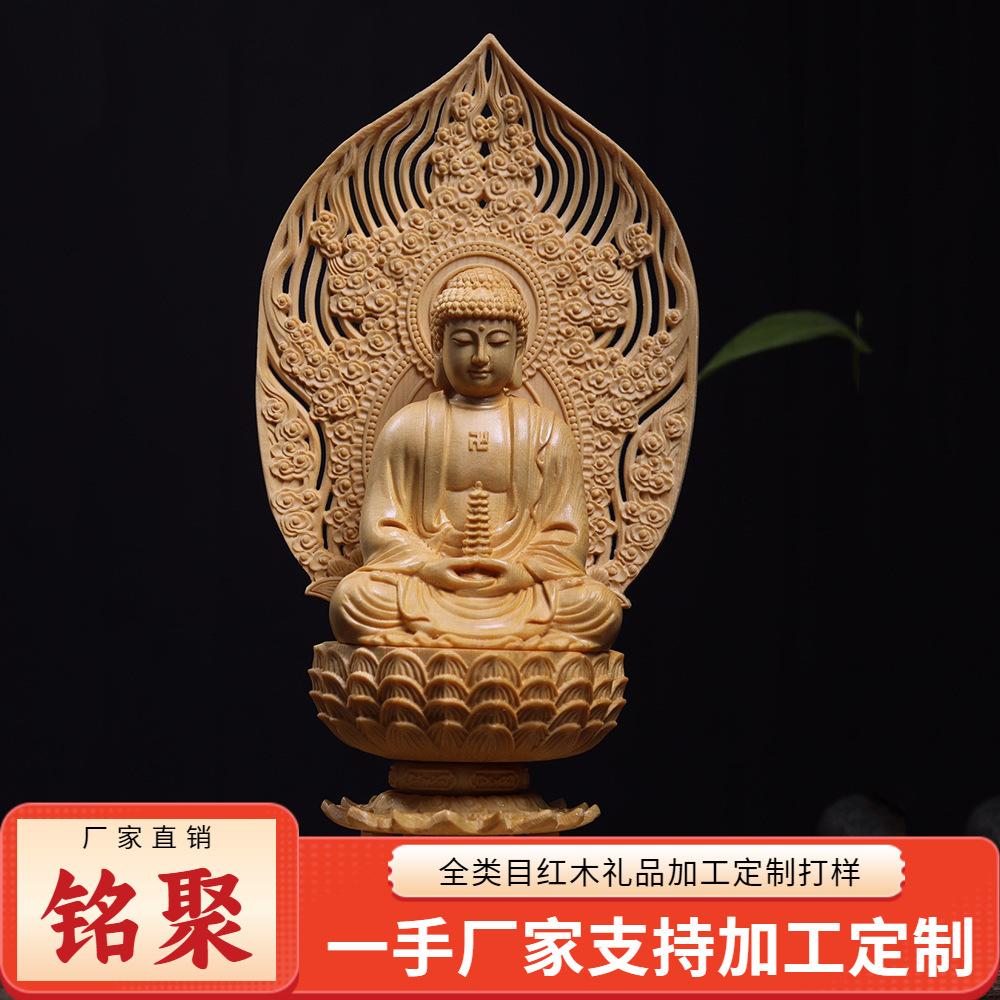 明州黄楊ヒノキ彫刻蓮座阿弥陀仏像飾り釈迦牟尼仏像三宝薬師仏工