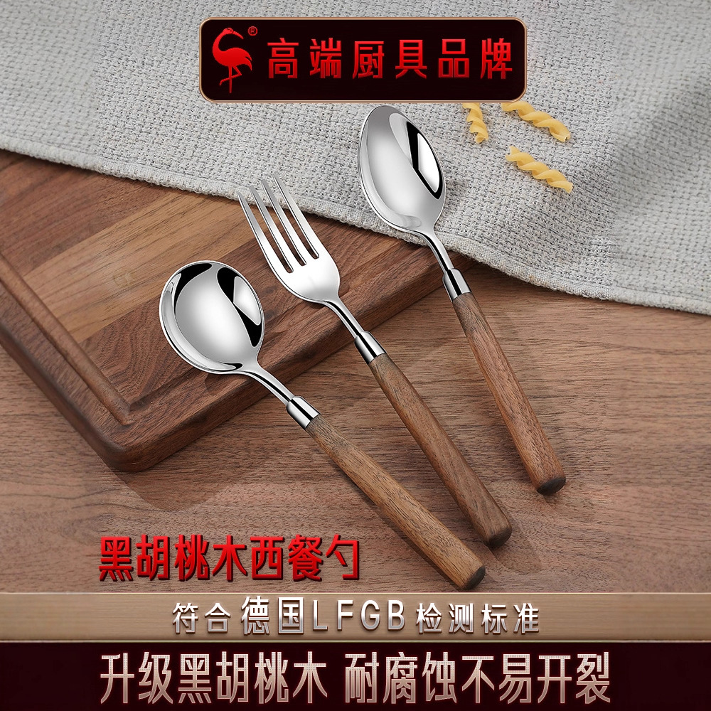三四鋼黒胡桃木スプーン304ステンレススプーン家庭用洗練された食器洋食スプーンスープフォーク