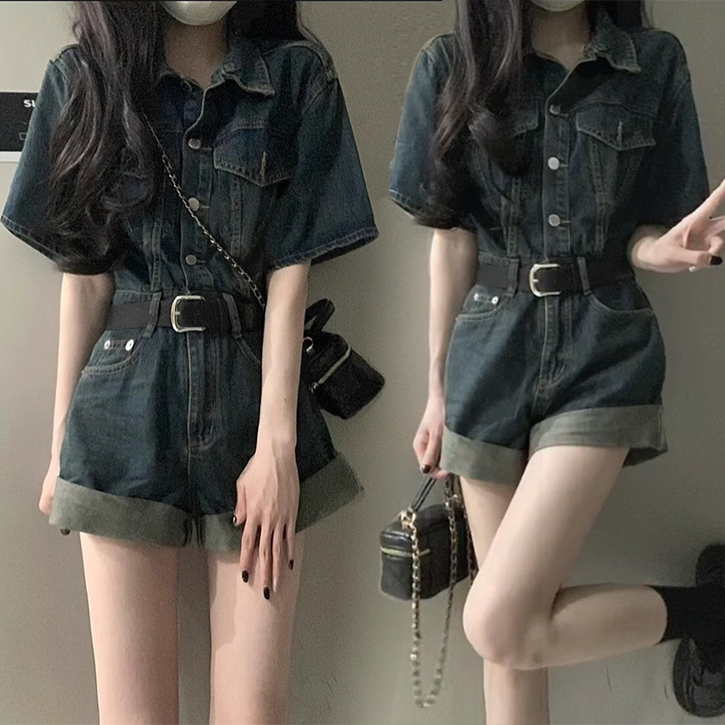 甘くてクールなハイウエストデニムジャンプスーツレディースショートパンツスーツリラックス感小柄な人向けの完全なセット2025新しいスタイル