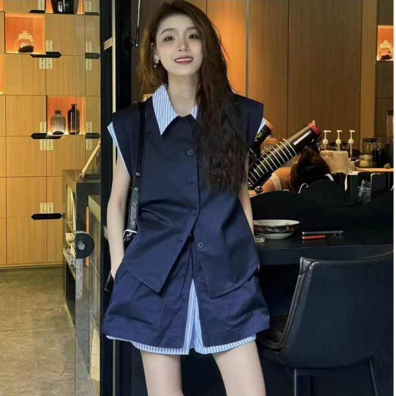 2025 新しい夏のファッショナブルで絶妙なストライプステッチ気質痩身偽ツーピーストップスとショートスカートツーピーススーツ