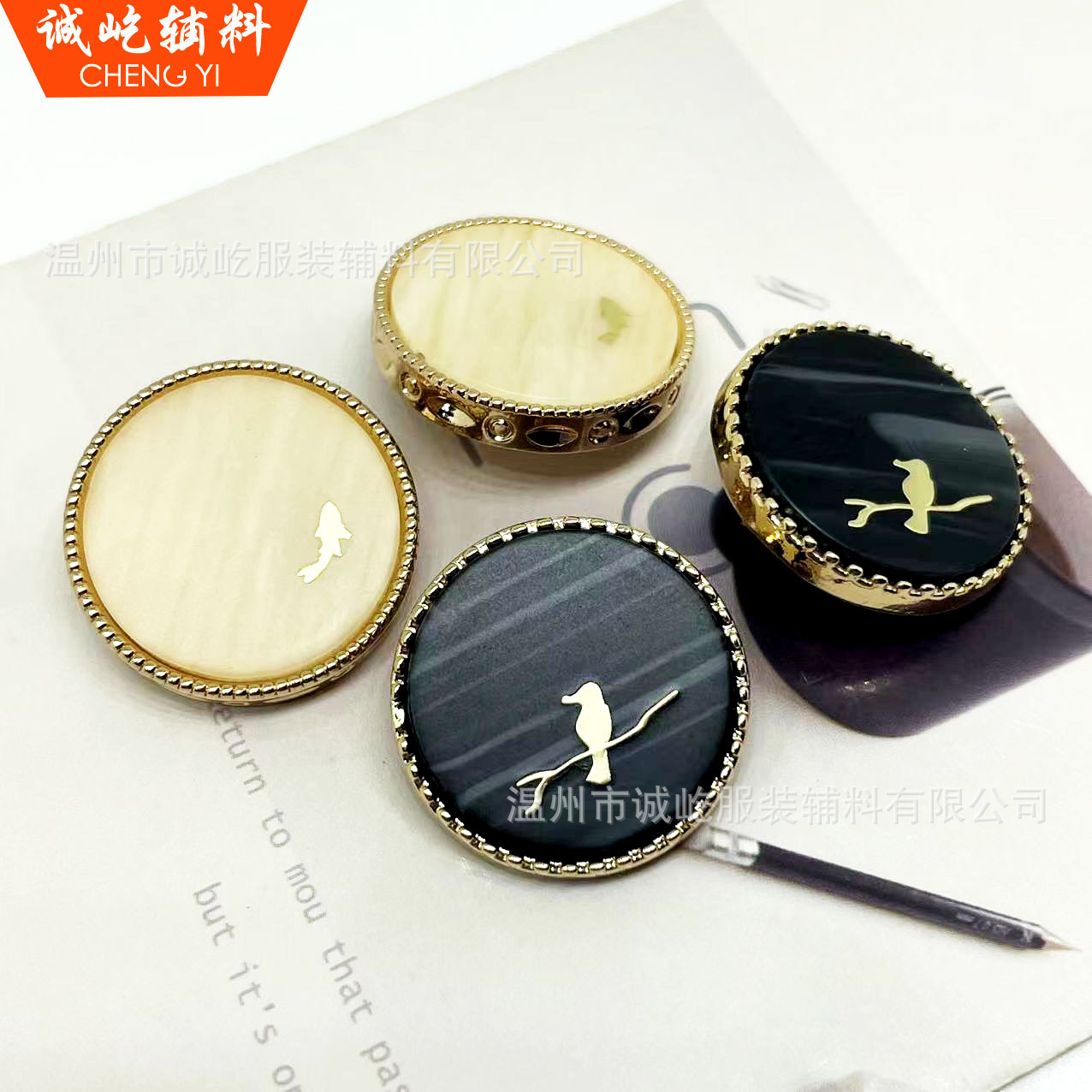 金属の底の歯の紋様の金の辺の樹脂の双つづりの組み合わせは小さい魚の小鳥の図案の樹脂の面のコートのスーツのボタンを掛けます